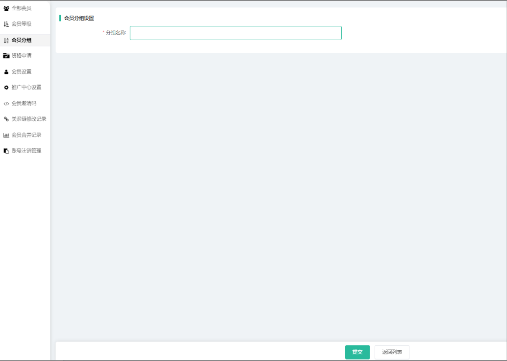会员分组:设置会员分组主要是为了便于在商城后台管理会员,商品支持按照会员分组设置购买/浏览权限。需要平台手动调整。