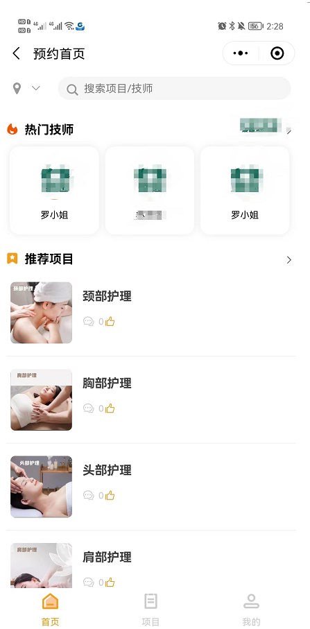 非技师、门店店长用户访问只有我的项目、我的预约两个栏目。