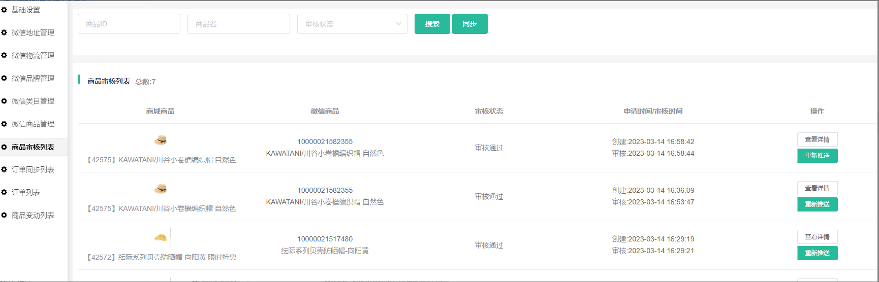 4.在列表点击推送会将商品推送到视频号小店,需要微信那边审核,审核通过或驳回都会通过服务通知发送给视频号店长、管理员、店员。
