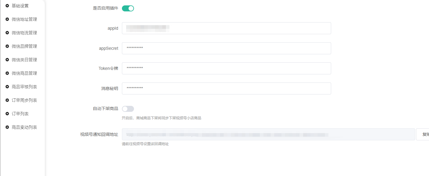 消息推送填写内容可以到后台插件复制回调地址填写到服务器地址处(Token令牌自行设置后填写到后台)