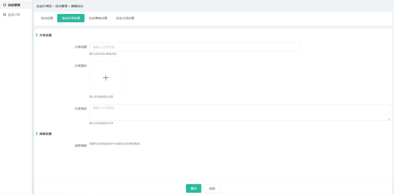 (3)开启新海报插件后,分享设置可选择海报模板,需在新海报插件中添加定金阶梯 团海报,选择模板后会以模板生成推广海报,否则默认模板生成;