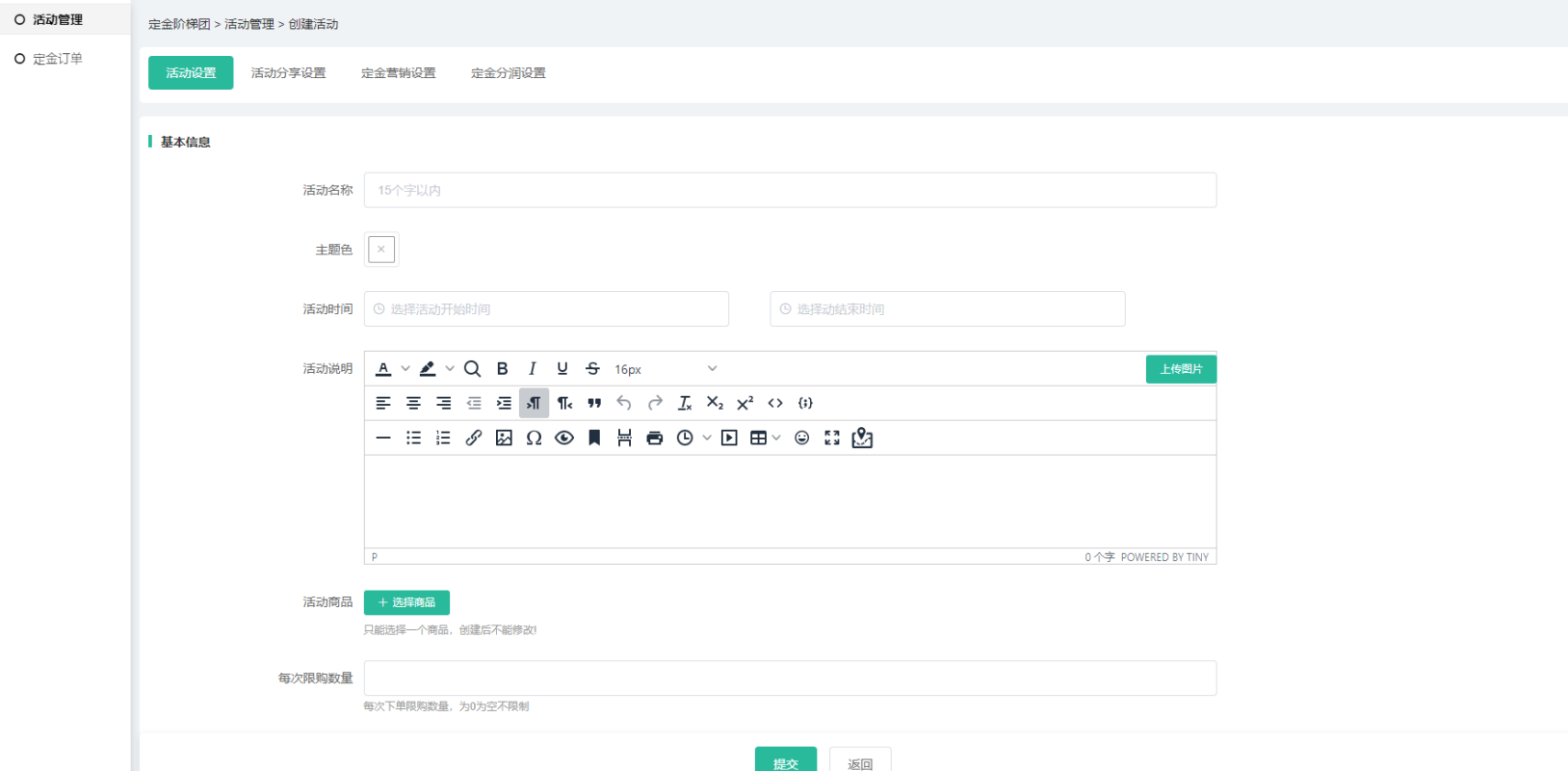 (4)营销设置和分润可设置活动定金的营销及分润信息,相应插件如未开启,则无法 设置,分润中所有插件都没开启则不会有分润设置导航;
