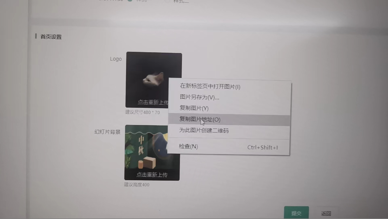 如何获取图片地址?——在商城后台随意一处图片上传的位置,上传图片,鼠标右击点击选择图片地址。如下图所示。