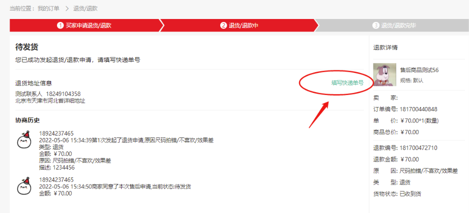 3.申请仅退款的等商家审核退款即可,若是申请退货退款的,等商家审核通过后,需要寄回商品,填写物流信息,寄寄回后,等商家收货,验货后确认退款。