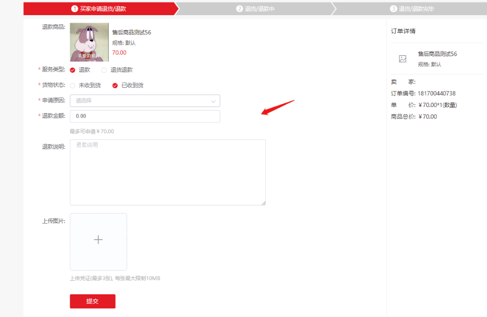 2.可以申请退款/退货退款,选择退款原因,填写退款金额,可以添加退款说明和图片;