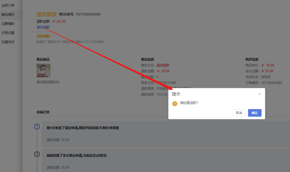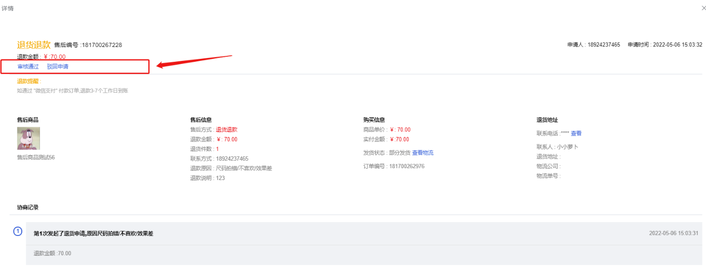 4.进入详情可查看退款信息,可操审核通过退款申请,或者驳回(驳回用户可以重新申请退款)