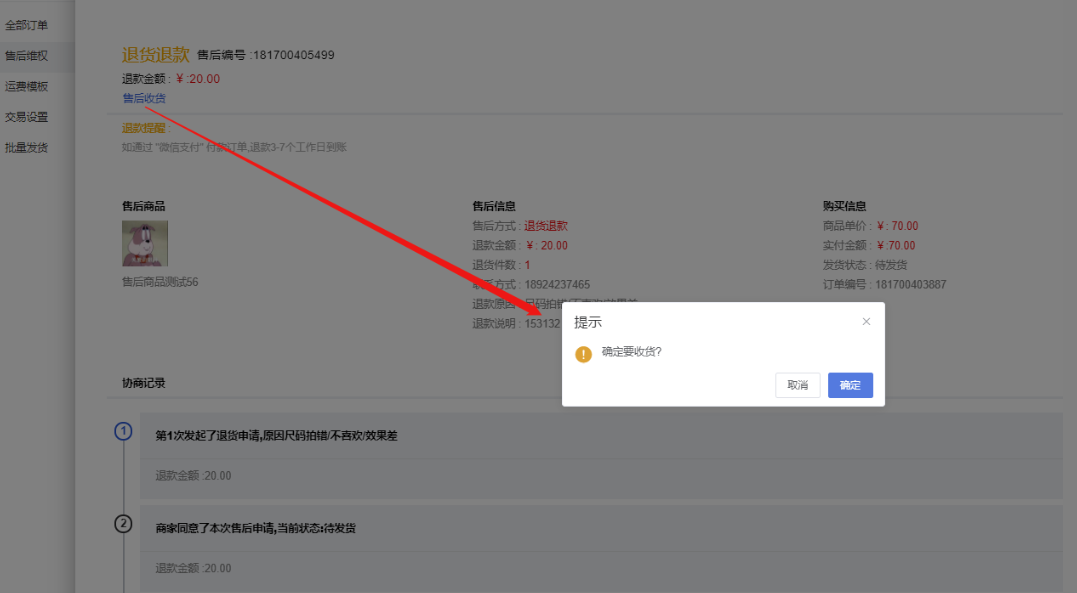 退货退款流程:用户申请退货退款--中台审核通过申请--用户寄回商品填写物流信息--中台确认收货--中台操作退款