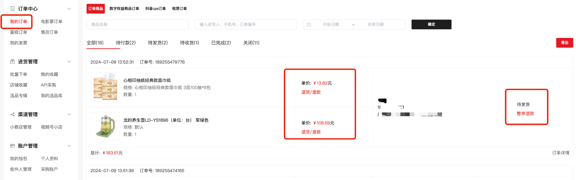 2.可查看全部售后订单,也可以按售后状态--待审核/待收货/待发货,切换查看对应售后订单;