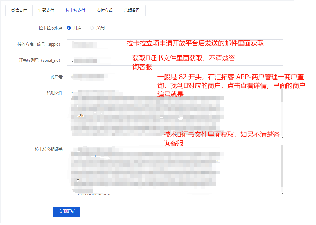 对接拉卡拉聚合收银台,具体章节可查看拉卡拉支付合作及操作流程,需要先跟拉卡拉进件