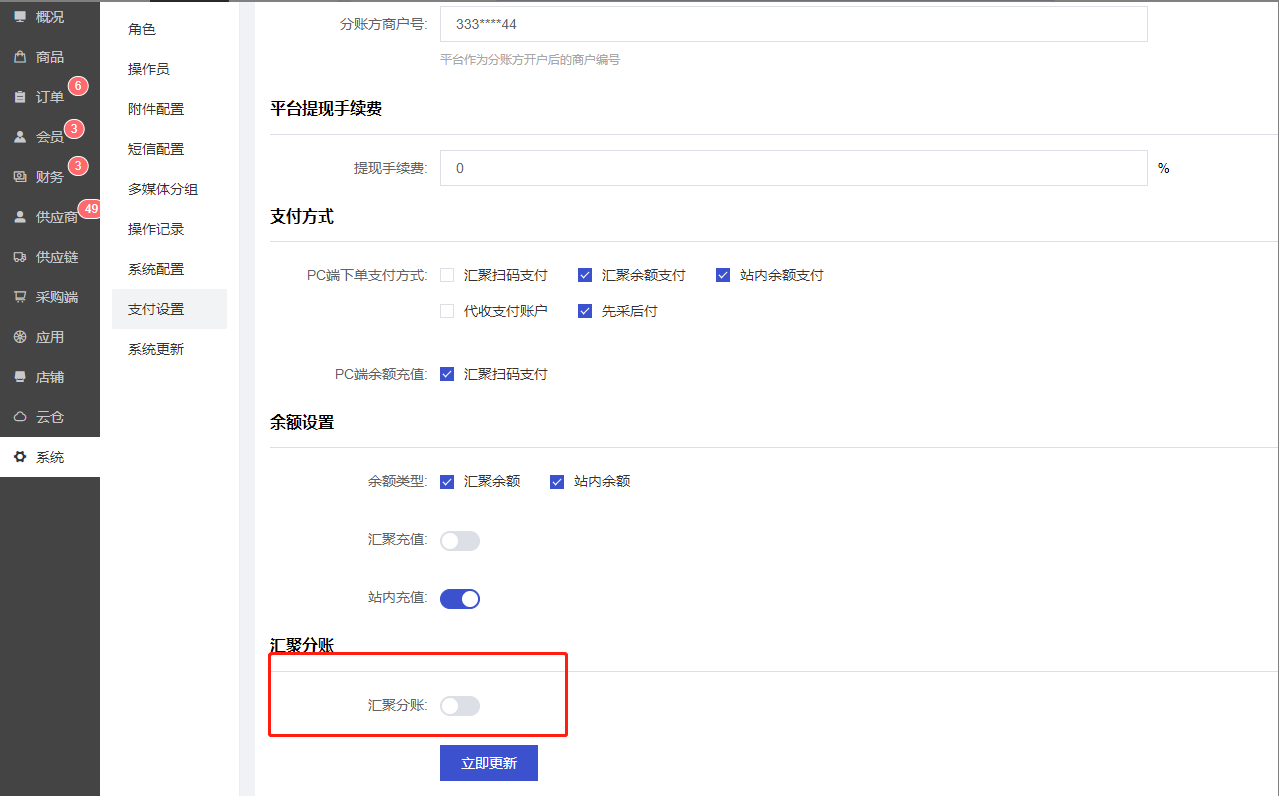 注:控制汇聚支付开关的前提是,汇聚支付的所有信息需要配置好,如果没配置 即使开关开了也不会显示。