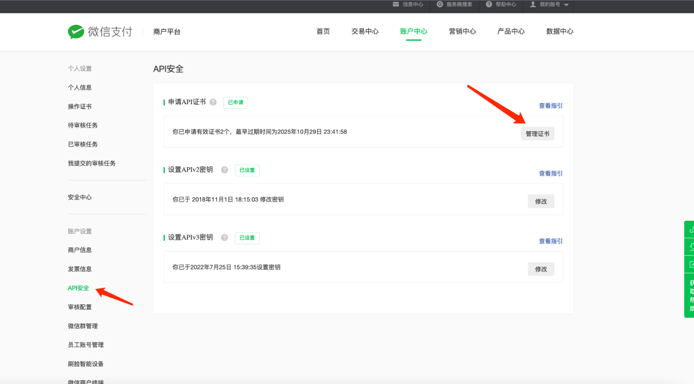 支付密钥:微信支付密钥(注意,必须是APIV3版的密钥)