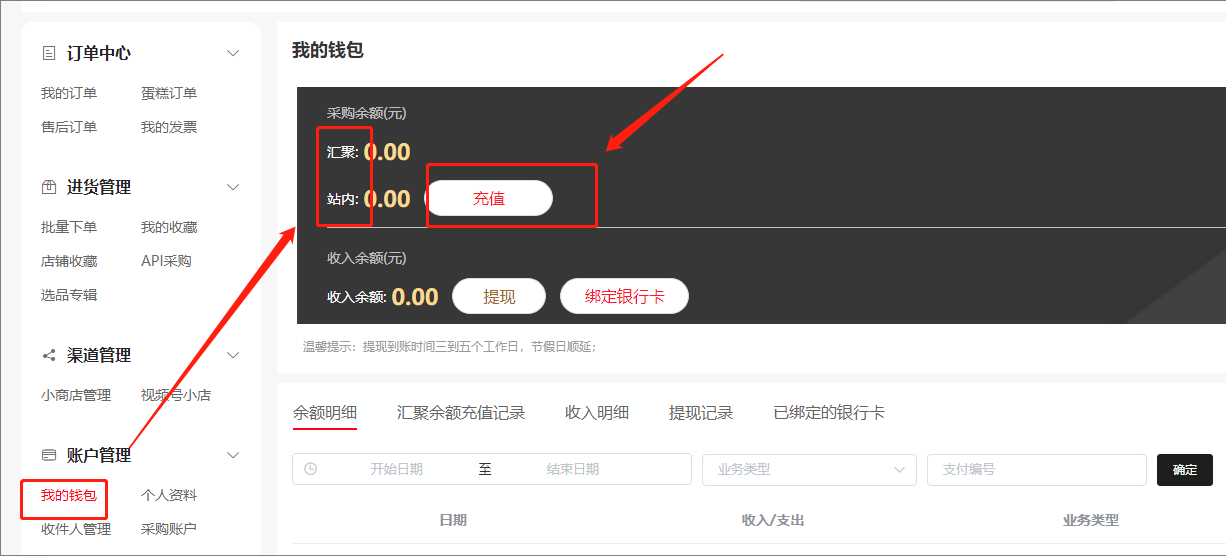 汇聚支付分账:采购端会员通过充值汇聚支付钱包余额,充值金额将作为待分账订单金额,当采购端会员PC端采购或者通过API同步订单采购后,将根据订单协议价+运费+技术服务费锁定钱包中的金额作为待分账金额;