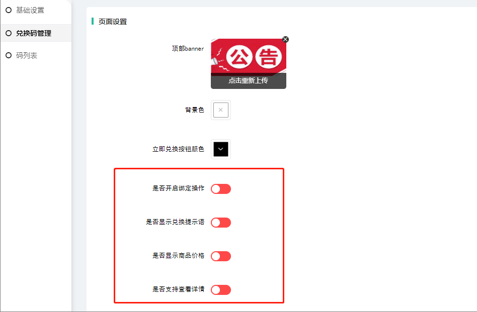 增加兑换码页面设置增加绑定操作、兑换提示语、商品价格、查看详情开关