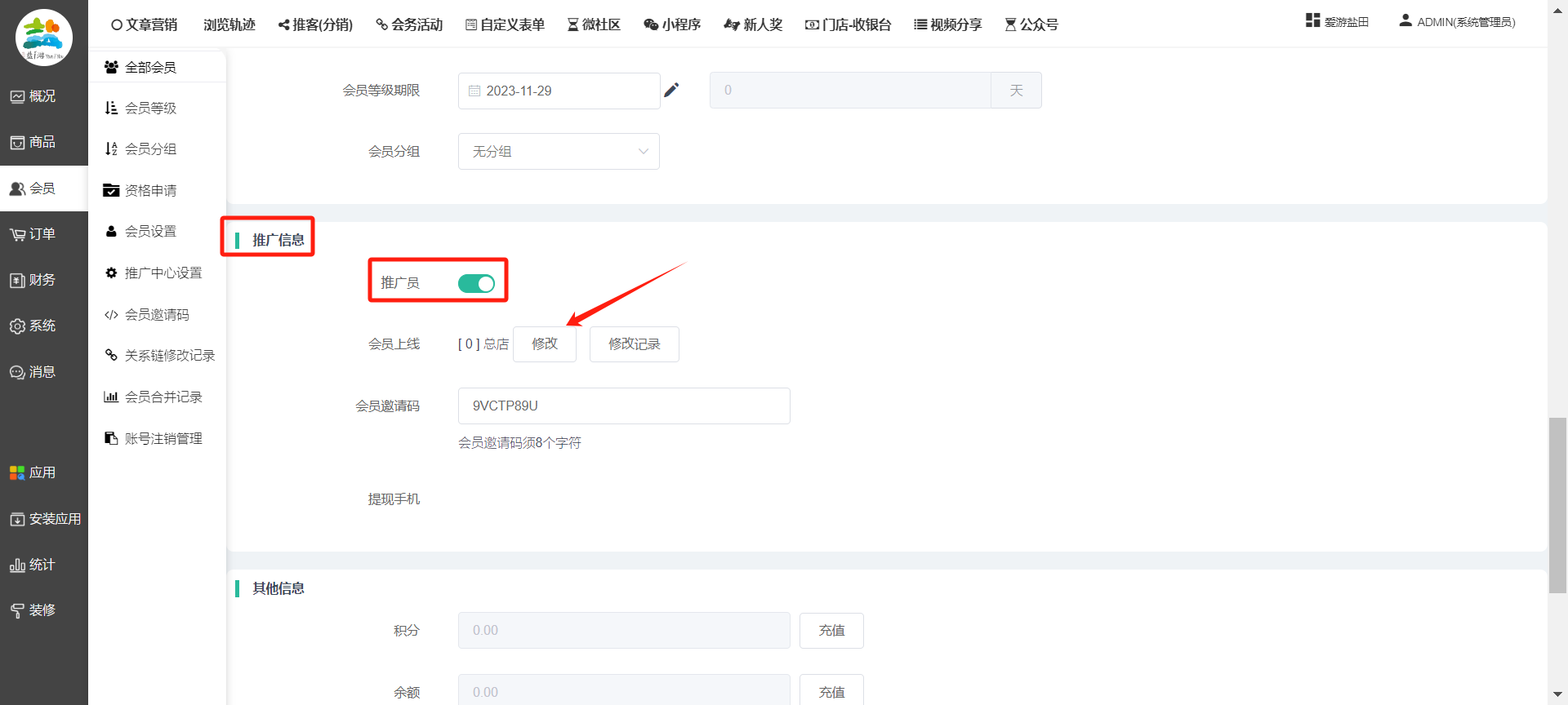 目录 搜索 展开 一、前期准备资料二、数字乡村码-上线操作指南1、服务号的申请流程及认证2、申请小程序流程3、开放平台绑定小程序和公众号三、数字乡村码-系统操作数字乡村码系统管理-概况数字乡村码-商品管理1、发布商品2、商品列表3、商品表单4、商品分类5、品牌管理6、配送模板7、评论管理8、优惠券管理9、商品标签10、退货地址设置11、满额优惠12、批量操作13、配送方式14、基础设置15、商品隐藏四、数字乡村码-会员管理1、全部会员2、会员等级3、会员分组4、资格申请5、会员设置6、推广中心设置7、会员邀请码8、会员关系链修改关系链修改记录9、会员合并记录10、账号注销管理11、会员设置中心五、数字乡村码-订单管理1、订单管理列表2、订单处理流程3、订单状态4、订单修改价格5、订单退款退货6、多包裹发货7、批量发货订单操作步骤8、催发货订单9、物流查询六、数字乡村码-财务管理1、余额设置2、会员余额3、充值记录4、转让记录5、余额明细6、收入明细7、提现设置8、提现统计9、积分管理10、转账审核11、收益广告12、批量充值七、数字乡村码-系统管理1、商城入口2、商城设置①、商城设置②、订单设置③、物流查询④、短信⑤、联系方式⑥、分类⑦、优惠券⑧、分享⑨、幻灯片⑩、广告位⑫、地图设置3、交易设置4、微信模板消息自定义消息模板(新版)自定义消息模板(旧版)小程序消息模板公众号模板消息变更公告5、语言设置6、权限管理7、多媒体管理八、数字乡村码-消息管理九、数字乡村码-应用管理十、数字乡村码系统-数据统计十一、数字乡村码-页面装修DIY1、模板管理2、店铺页面3、顶部导航4、底部导航5、DIY模板市场6、首屏广告7、基础设置8、装修DIY尺寸建议十二、供应商功能插件操作指南1、供应商2、门店-收银台门店申请和使用步骤门店管理①、门店-收银台 营销设置②、门店-收银台 分润设置门店分类门店申请门店审核门店商品门店商品订单收银台订单数据统计核销员基础设置默认设置门店装修3、微社区4、会务活动十三、营销插件操作指南活动报名提货卡新人奖微店问卷调查积分视频分享1、视频分享基础设置2、视频分享发现管理3、视频分享分类管理4、视频分享评论管理5、视频分享分红记录6、视频分享短视频中心每日红包幸运大抽奖签到优惠券二维码任务奖励优惠劵文章音频文章付费文章限时购新海报拓客卡操作流程积分活动素材中心视频红包十四、入驻门店应用类1、门店预约2、附近商品3、门店定位设置4、门店控制5、门店满额包邮6、门店满额减7、导入商品8、门店搜索9、门店股东10、核销券11、多门店核销1、商城后台设置2、前端功能演示十五、常见问题1、后台登录密码修改流程2、会员-余额,积分,后台如何进行充值与扣除3、如何修改上下级关系4、一种万能的获取商城小程序路径的方法 暂无相关搜索结果! 阅读次数:2083 本文档使用 模王系统 发布 8、会员关系链修改 8、会员关系链修改一.如何修改上下级关系?1.会员-全部会员-可以通过搜索用户的独立ID,或者用户微信昵称,找到此会员,然后点击右边的(操作)2.再点击会员详情。3.滑到下面,有个推广信息-会员上线,点击修改4.输入上级的ID号,点击搜索,出来此上级会员后点击选择。5.滑到最下面,一定要点击提交按钮。文档更新时间: 2023-11-30 14:56 作者:链上旅行