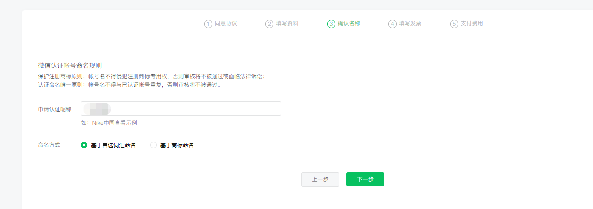6.点击“下一步”,确认填写信息,在此处可以更改刚才的公众号名称,确认后需要等下次年审的时候再更改