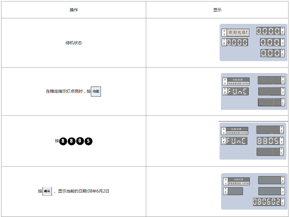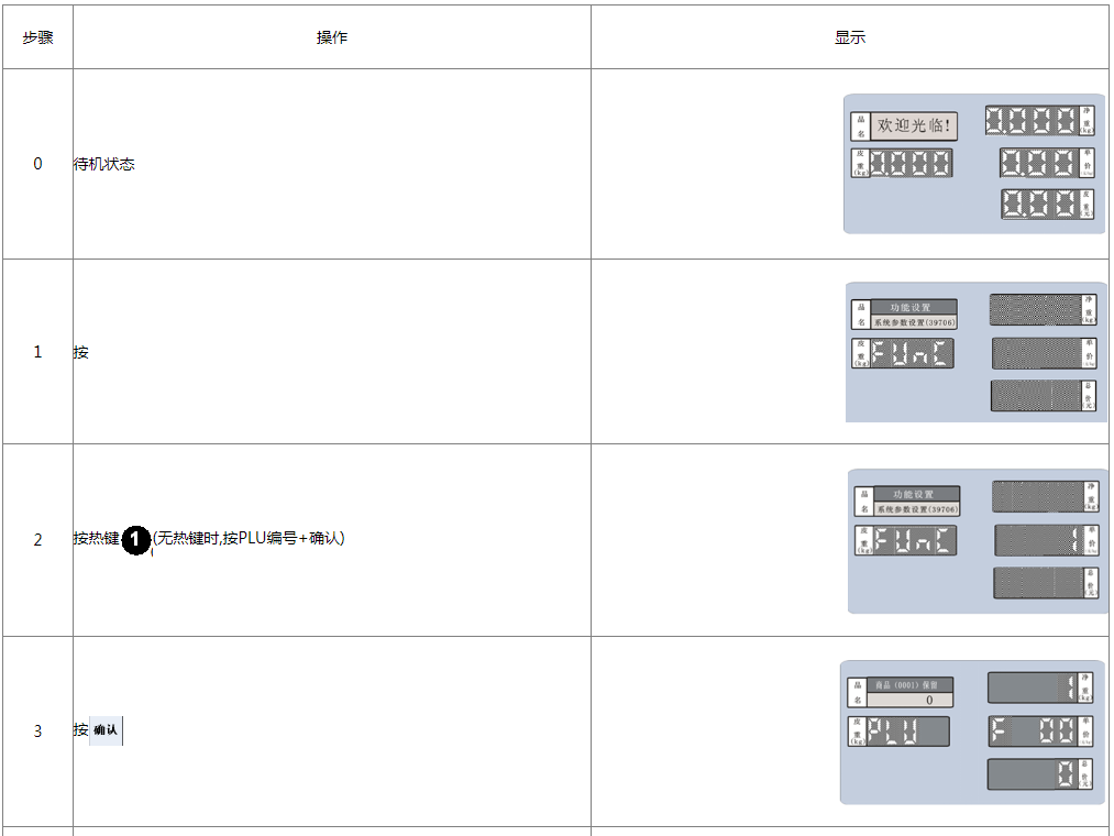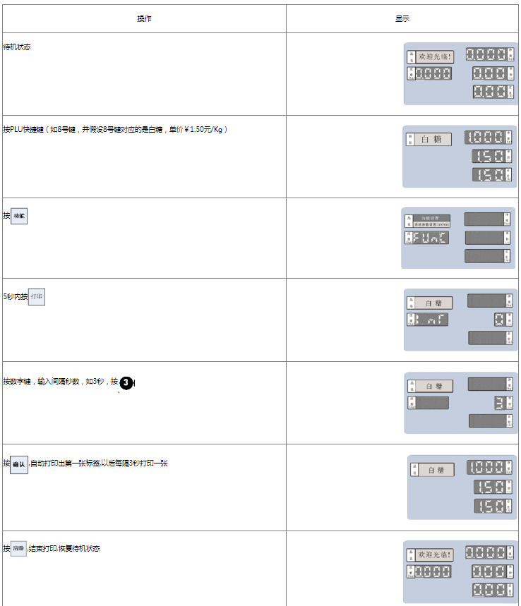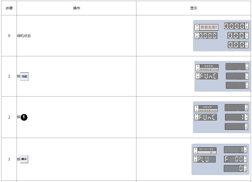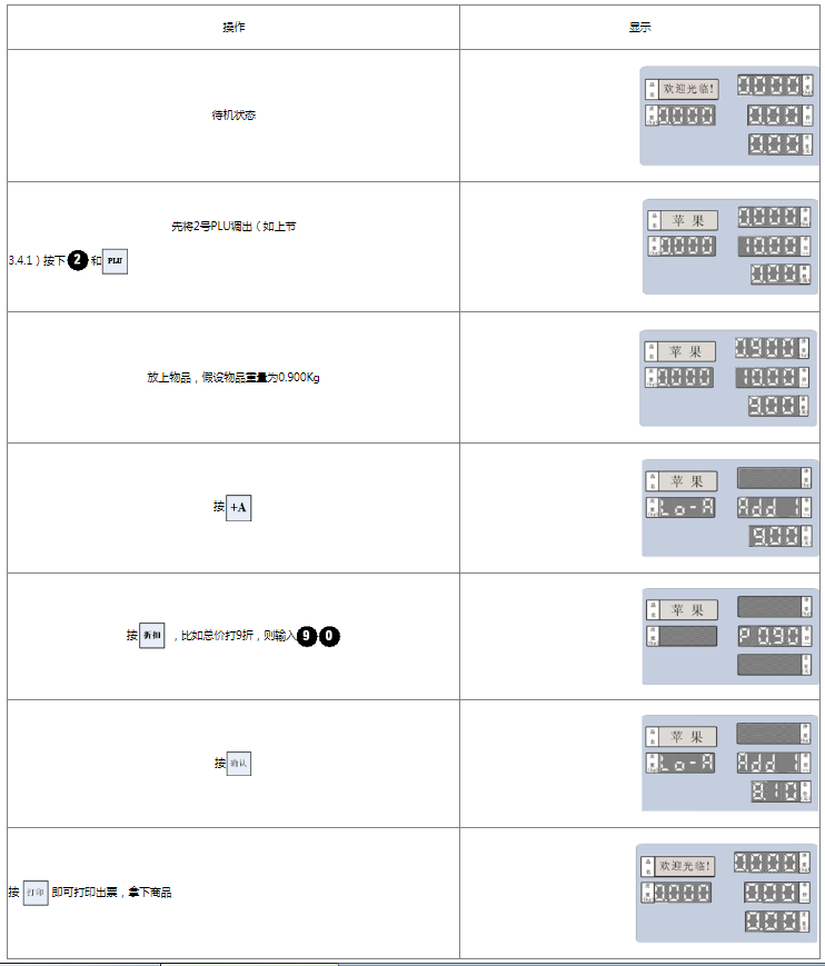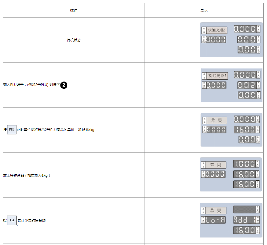 阅读本手册时,操作见表格最左列,表格其余列为实施最左列操作后条码打印计价秤各个窗口的显示内容;
