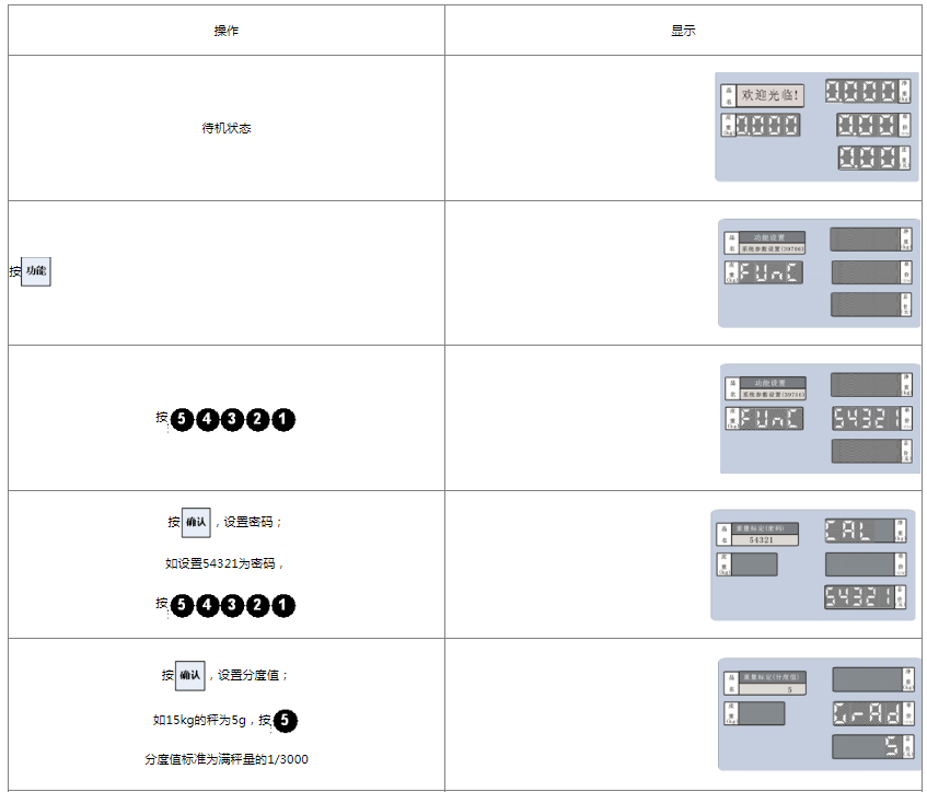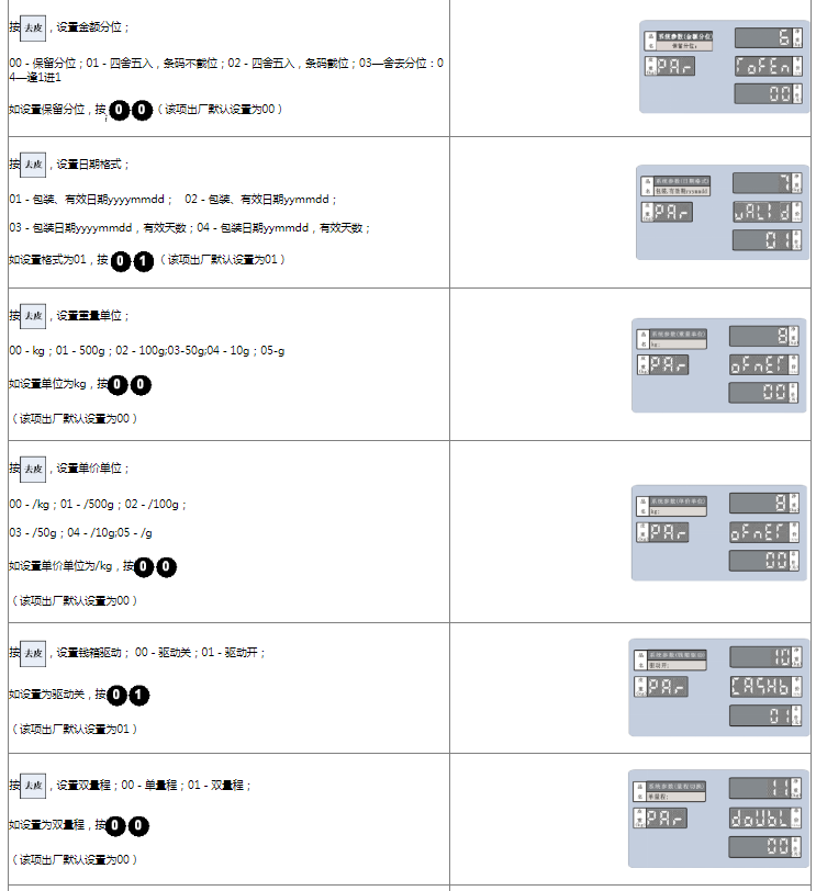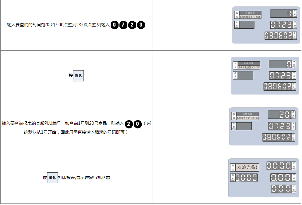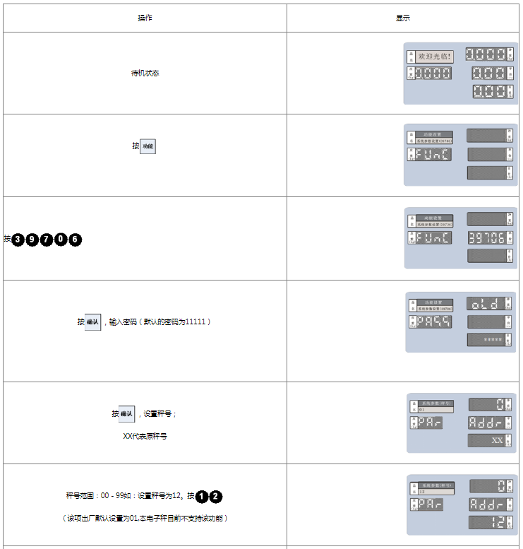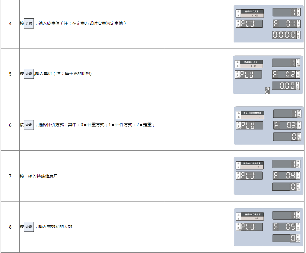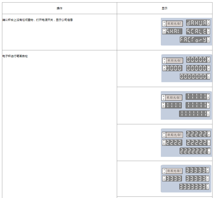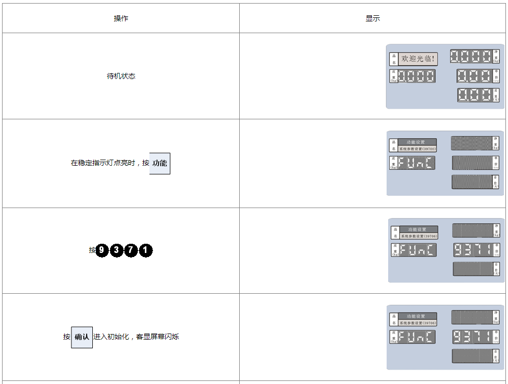 阅读本手册时,操作见表格最左列,表格其余列为实施最左列操作后条码打印计价秤各个窗口的显示内容;