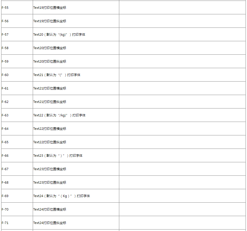 本秤可设置16条汉字文本(编号从1到16)及16条字符文本(编号从17到32),可供每种标签格式任意调用打印;其中1号汉字文本在连续纸状态下为店名。每条汉字文本内容最多可设置30个汉字,每条字符文本内容最多可设置30个字符。(注:汉字文本使用区位码输入;字符文本使用ASCII码输入。)可以用密码4001~4032进入对应的Text文本也可以输入4001~4032中的任意一个密码进入然后按倍数键切换不同的Text文本。