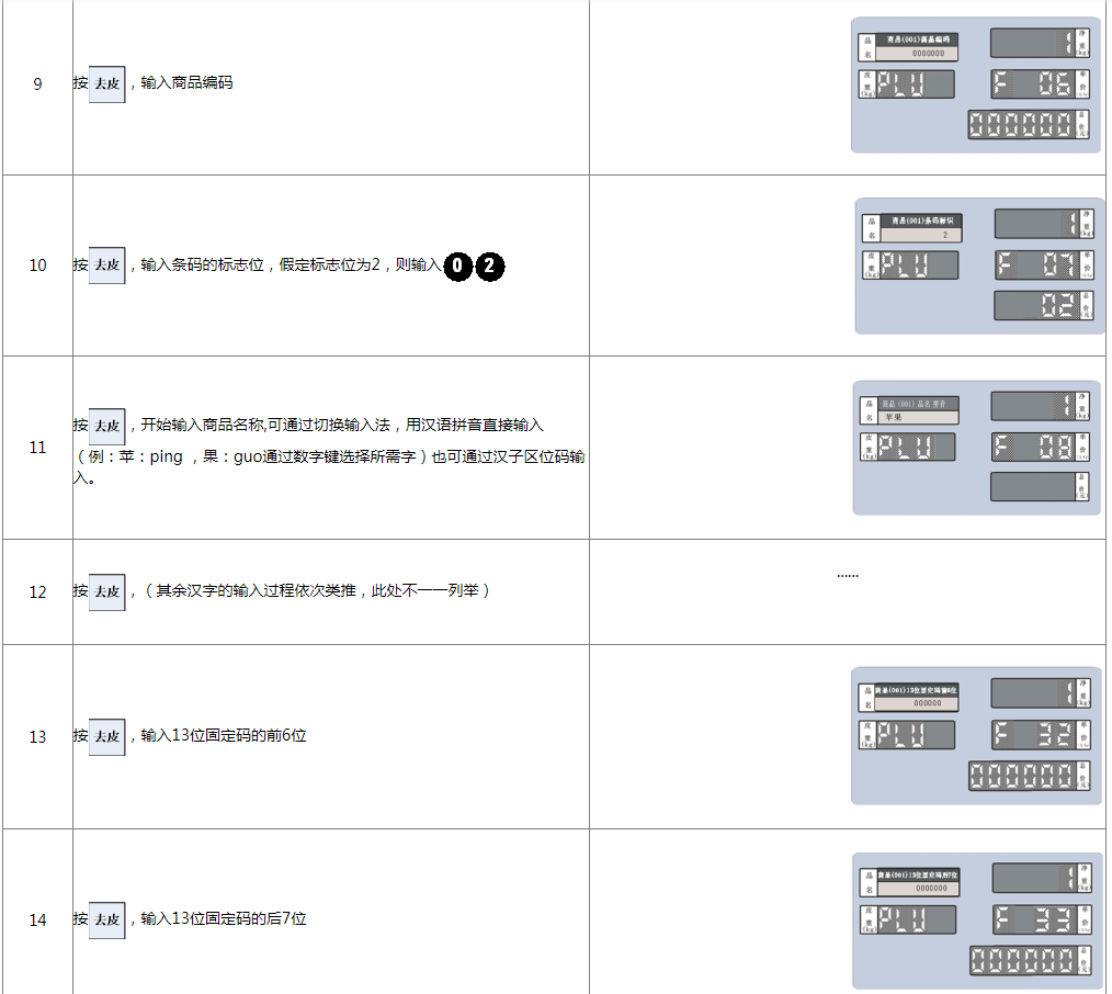 本秤可存储9999条PLU信息,编辑PLU信息的方式为: