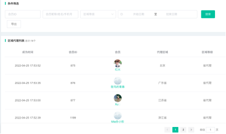 1) 会员成为招商员就会在该列表显示,在该列表可查看到招商员成为时间,会员信息区域代理人数