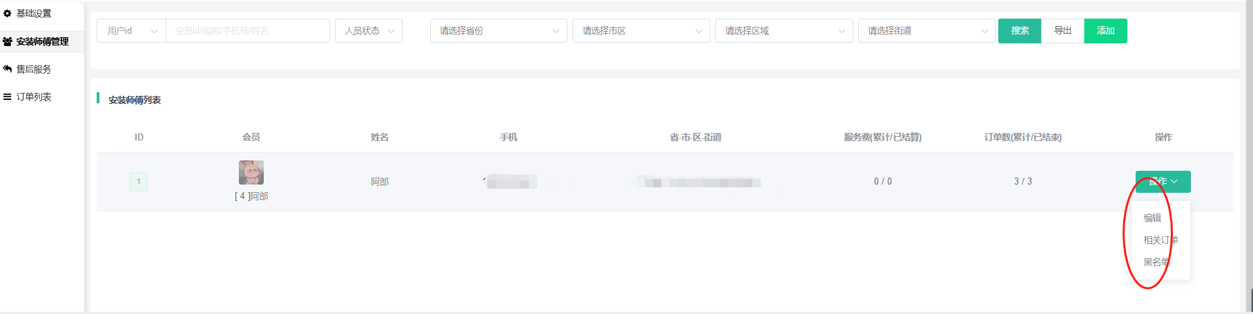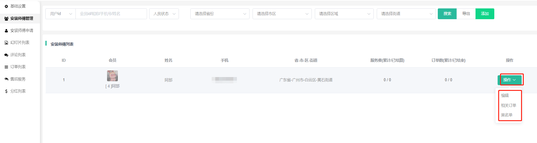 5、点击操作--黑名单可把安装师傅加入到黑名单,加入黑名单的安装师傅不能再进行接单,已接单的可继续完成,收入会正常结算