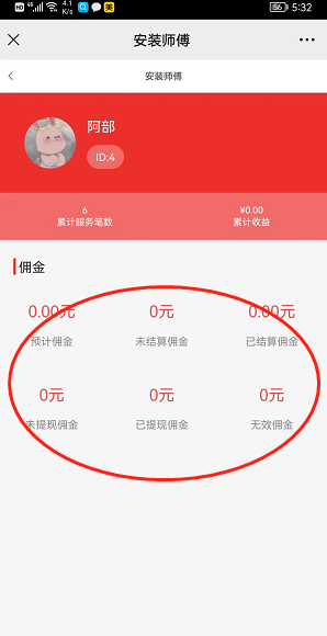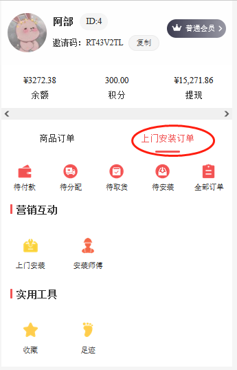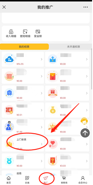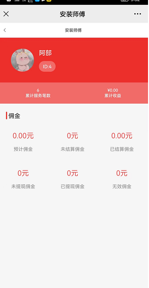 10、会员成为安装师傅后还可在推广中心查看到上门安装入口,点击进入可查看到分红情况