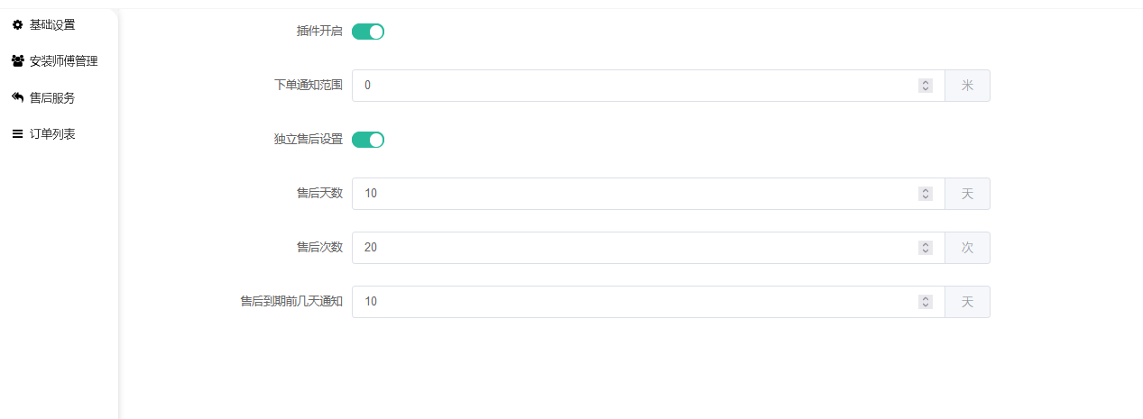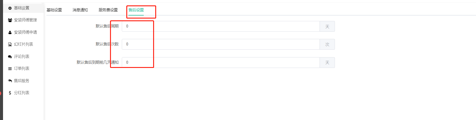 售后从安装完成的时间开始计算,按照单个商品计算;如一个商品购买多件,则售后上线为商品的售后次数*商品数量,售后申请审核通过扣除次数;商品、门店可独立设置售后,优先度为商品独立售后(商品挂件)>门店独立售后>平台设置的售后