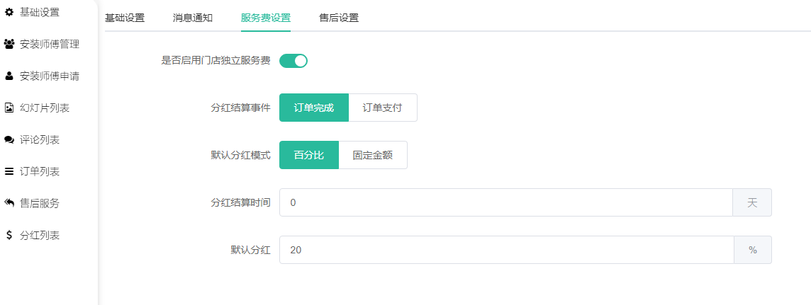 举例:默认分红设置20%,上门安装订单服务费100,那安装师傅可以获得的分红:100*20%=20元