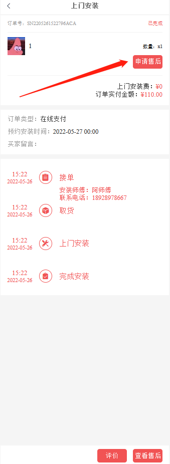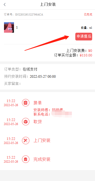 5、点击订单查看详情可查看到上门安装信息,订单商品的售后到期时间(安装完成才显示),售后次数