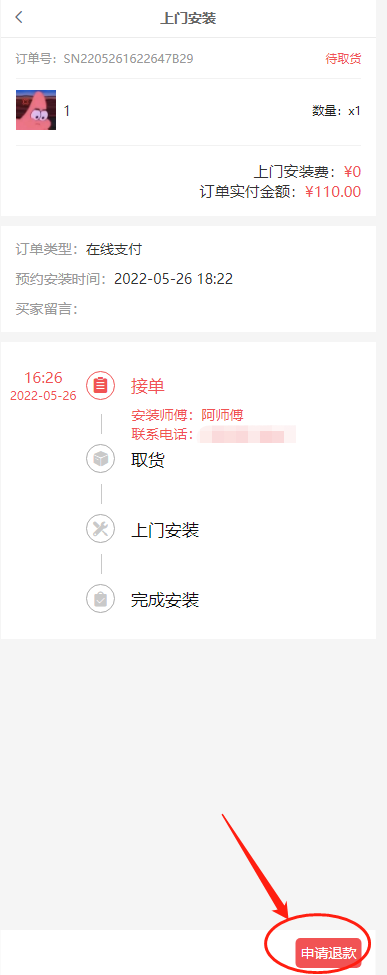 9)已关闭,订单在待支付状态超时未支付,或者用户取消订单,或者用户和后台退款了,就会进入这个状态。只有在安装师傅取货之前,才可以申请退款。PS:退款不退服务费