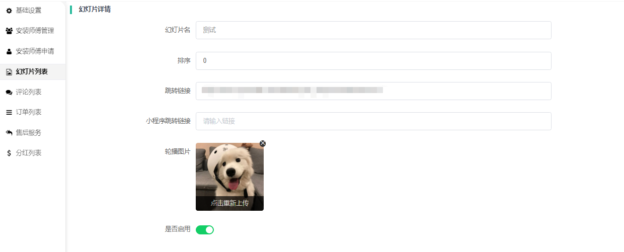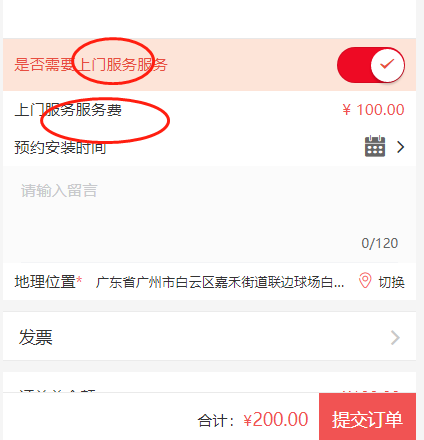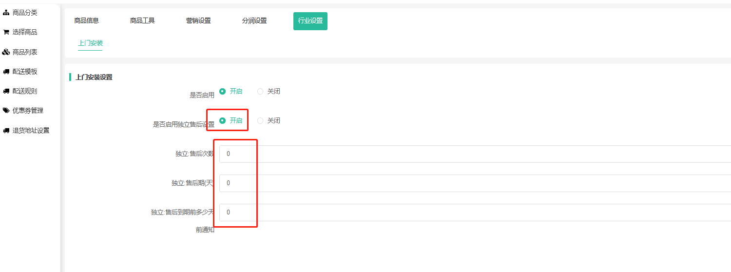 上门安装设置是否启用:开启上门安装功能,设置安装服务费