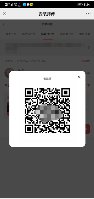 6) 在待到付状态,会员可以在前端点击订单进行支付,或安装师傅出示付款码,会员扫描后会进入该订单的订单详情页面,点击支付按钮进行支付。