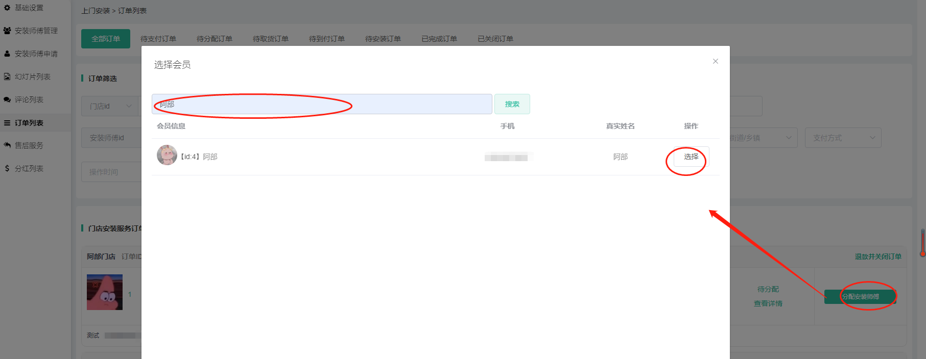 4、在订单列表可分配/修改安装师傅(可选择所有安装师傅,不区分门店)