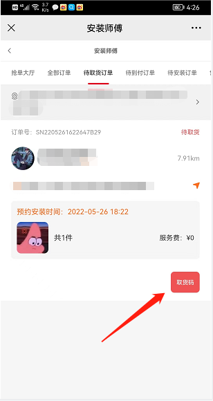 3 )待取货:安装师傅在前台抢单大厅抢单成功或者后台已经把订单分配给了安装师傅,但是安装师傅还没取货