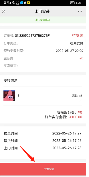 7)待安装:等待安装状态,安装师傅点击完成并上传图片则订单完成。