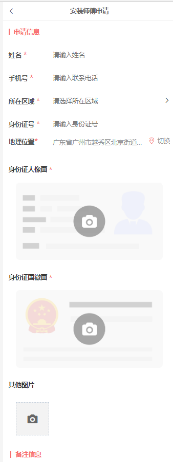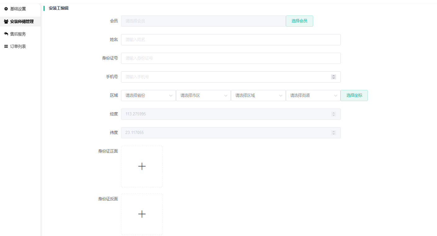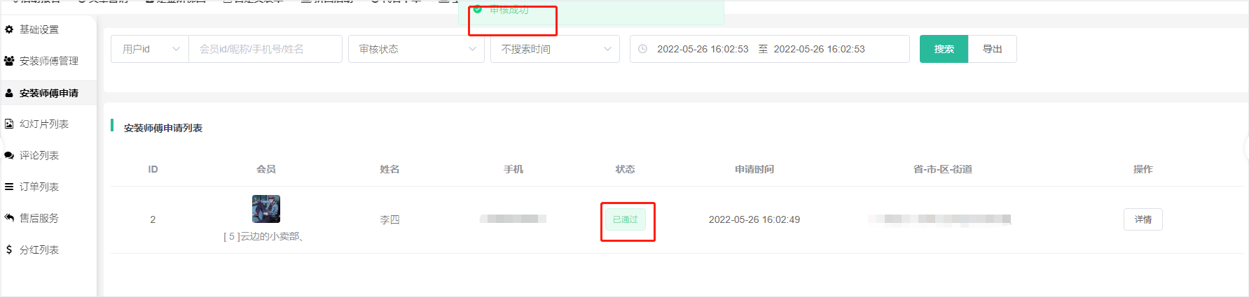 1、 会员在会员中心申请成为安装师傅,填写信息点击提交后后台需要审核