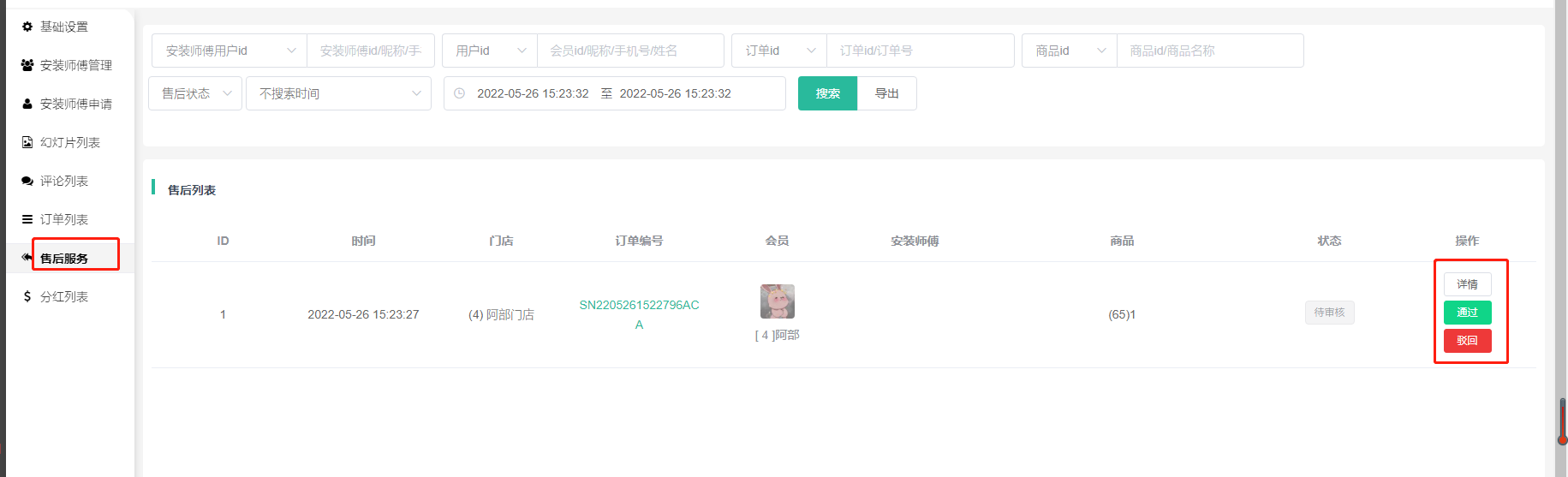 1、用户在安装完成后可以申请售后,后台进行审核,驳回,默认会把售后分配给安装该订单的安装师傅,但是如果这个师傅被拉黑了,就会变成等待后台分配。前端安装师傅端,只能看到分配给自己的售后,看不到分配给其他师傅的售后