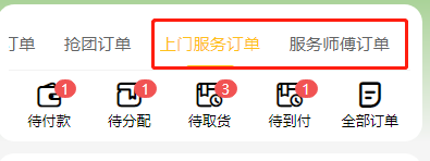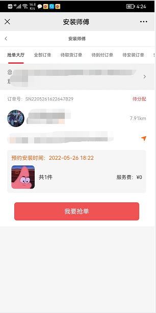 2) 待分配:用户下单后支付了或者选择了货到付款(安装服务的货到付款跟商城的货到付款不一样),此时等待安装师傅抢单或者商城后台分配订单