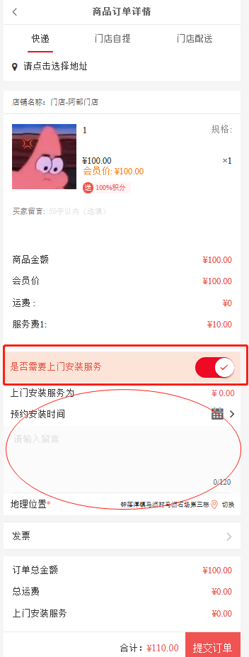 2、选择上门安装商品下单在提交订单页勾选上门安装服务,设置预约安装时间,安装地区,留言内容(上门安装只支持快递这一种配送方式)