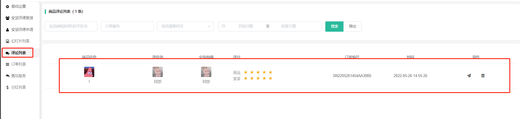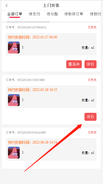 评论列表:这里的列表只显示安装服务订单的评论,在商城的评论列表也会显示这些评论,但是没有安装师傅评级,评论详情跟商城是共用的。前端进行评论的时候,如果是安装订单,会额外增加一个安装师傅评级