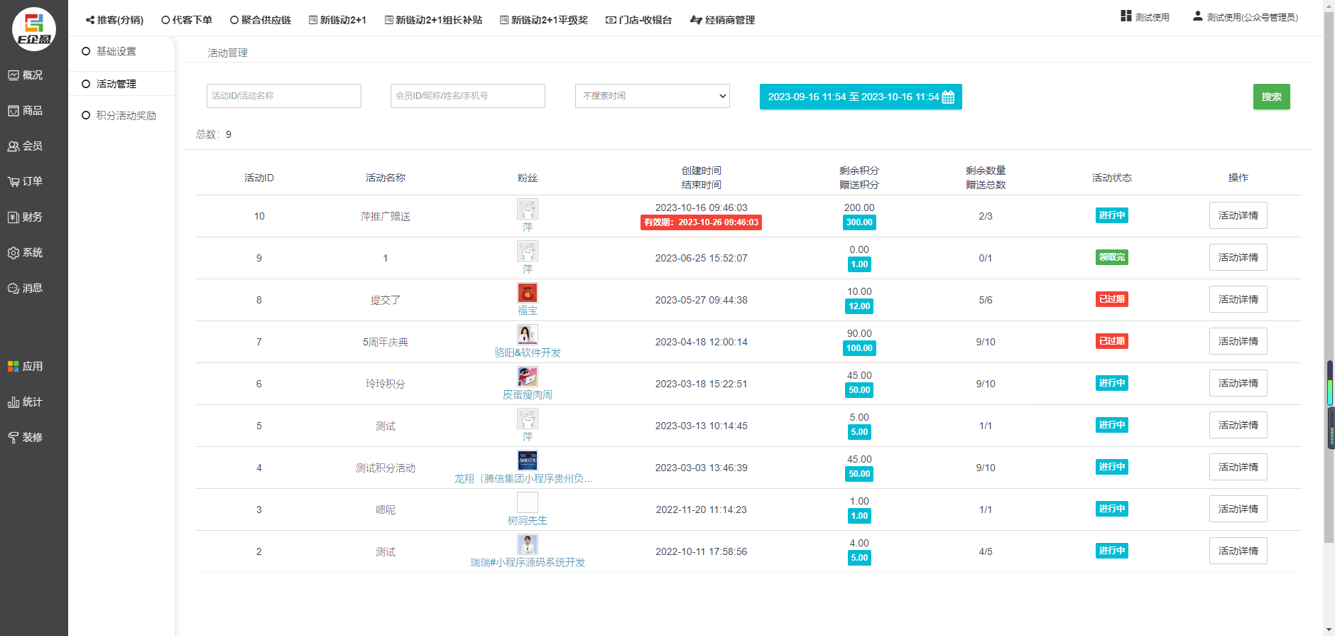 2,活动管理 会员创建的活动在这里显示,可以查看活动名称,粉丝,创建和结束时间,剩余积分等这些~