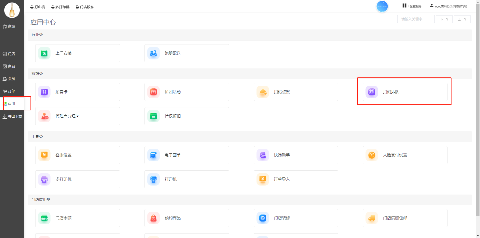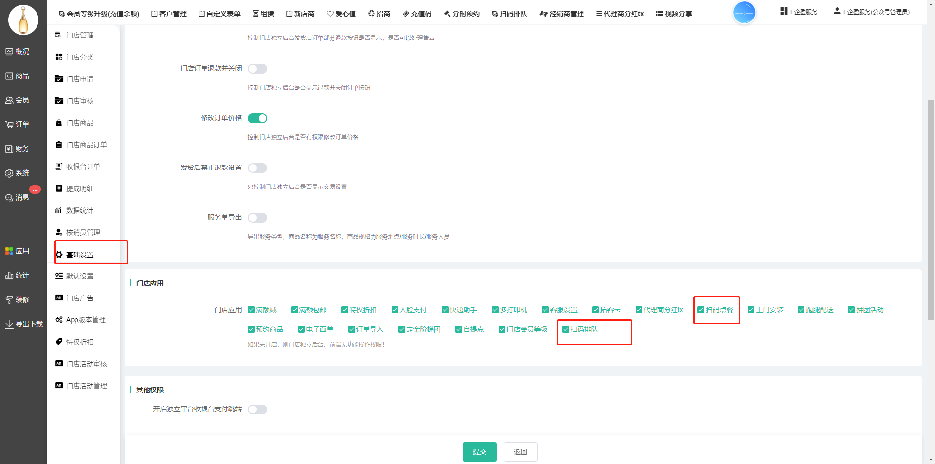 门店收银台-基础设置-权限设置-勾选扫码点餐和扫码排队的功能