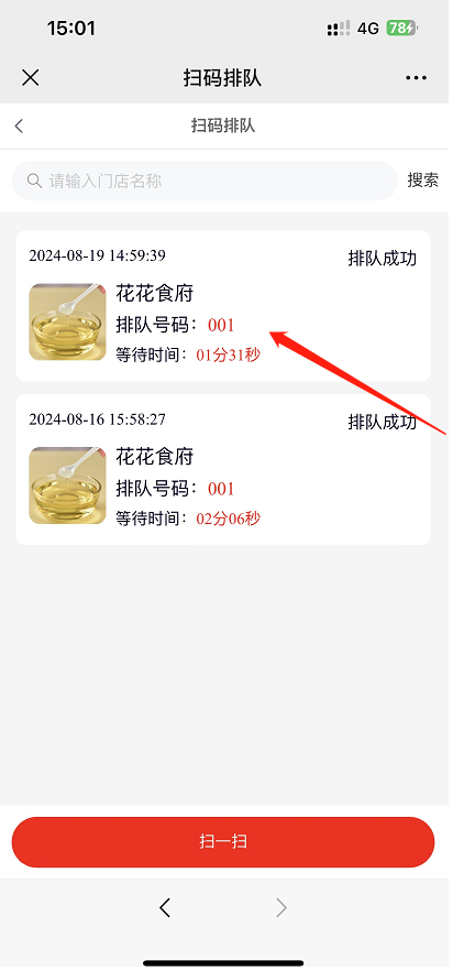 1)显示会员扫码排队后,再扫餐桌码的记录