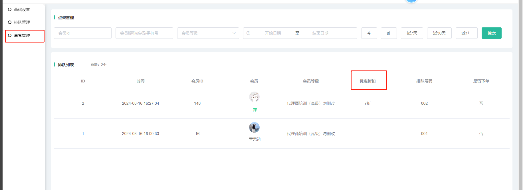 2)首次扫码点餐支付享受优惠,就餐再次扫码支付不再享受折扣。 按会员等级、排队时长设置不同的折扣,排队开始时候按会员扫码时间开始计算,结束时间按扫码开始点餐就结束。