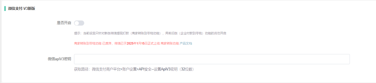 (一)商城后台 -- 系统 -- 支付方式 -- 开启微信支付-V3新版开关,并填写相关配置;
